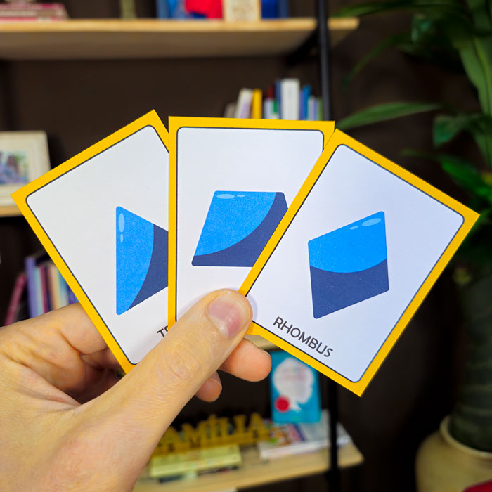 The child carefully examines a group of shapes and figures out which one doesn’t follow the pattern. To mark their answer, they use an indicator card while saying the shape out loud.